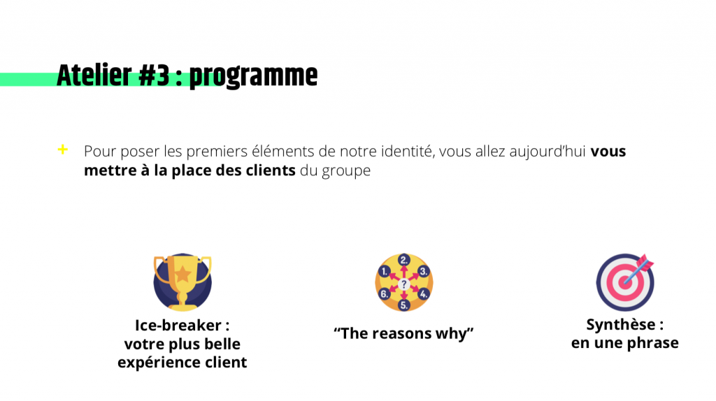 Cette seconde phase mobilise la matière issue de la première, chaque workshop proposant une réflexion autour de la mission et des valeurs du groupe.
