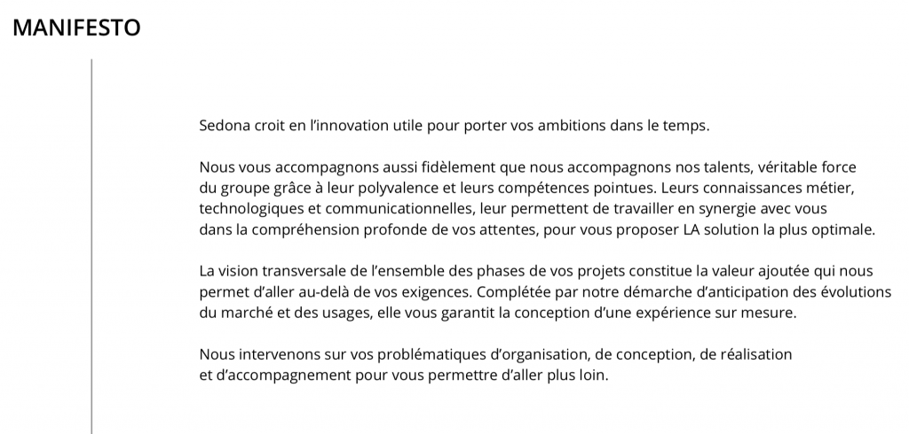 > Une difficulté à formuler la promesse de Sedona auprès des clients et prospects, ainsi qu’une difficulté de leur part à cerner l’ensemble des champs d’action du groupe